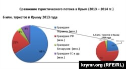 Отельный сегмент пережил это полугодие еще хуже. Но не везде, в отелях Симферополя случился настоящий «туристический» бум. «Даже не мечтали о таком! Загрузка 100-105%, дополнительные места все проданы! Подняли цену на 80%, и это никого не испугало! Выкупали сразу на 15-20 дней, а некоторые номера выкупили на месяцы!», – прокомментировал ситуацию восторженный директор одного крупного отеля крымской столицы. Так въезжали в Крым российские фсбэшники, грушники, работники российских СМИ и многочисленные чиновники. К туризму это, конечно, имеет далекое отношение... Так родился новый вид туризма – «по случаю аннексии» или «в связи с оккупацией». Цель поездки: «аннексия территории».