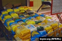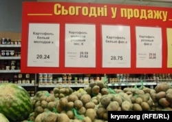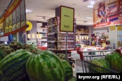 Овощи здесь явно украинские – и по словам продавцов, и по простой логике. Крупные торговые сети договора о поставке продуктов с мелкими производителями не заключают – ведь нужна гарантированная, бесперебойная да еще и круглогодичная доставка продукции в сеть. А откуда в Крыму крупные поставщики овощей и фруктов? Когда Крым в зоне рискованного земледелия и заморозки каждые два года убивают урожай фруктов, а картошка тут растет только на крестьянских подворьях? Ну, разве что лук местные корейцы на севере Крыма выращивали в промышленных масштабах. Но теперь, когда воды в Северо-Крымском канале нет, и корейцы не помогут.