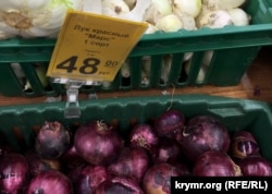 Встретить овощи с материковой Украины по-прежнему можно и в крымской сети магазинов «Продукты у дома» (ПУД), в прошлом – АТБ. Лук, картофель, морковь – производитель указан на ценнике.