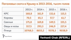 В частности, поголовье скота на полуострове сокращается рекордными темпами: в сравнении с 2013 годом, крупного рогатого скота стало меньше на 32%, овец и коз – на 30%, птицы – на 16%, свиней – на 12%.
