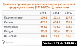 И такая картина вполне объяснима: большинство сельхозкультур Крыма выращивалось на поливных землях, а из-за перекрытия Северо-Крымского канала количество орошаемых земель в Крыму сократилось в 13-14 раз: со 130-140 тысяч гектаров в 2013 году до 10 тысяч гектаров в 2015-16 годах.