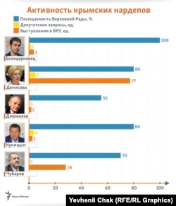 Самым активным депутатом среди крымских нардепов оказалась Людмила Денисова. В Раде она возглавила Комитет по вопросам социальной политики, занятости и пенсионного обеспечения, что и определяет сферу ее интересов в парламенте. За два года работы Денисова выступила в стенах Рады в общей сложности 77 раз (54 – с трибуны). Она внесла 236 законодательных инициатив, правда, крымской проблематике из них посвящено всего 2: проект Закона об усилении защиты внутренне перемещенных лиц (№1496), который был принят парламентом, и внесенный 4 февраля 2016 года законопроект о внесении изменений в закон о СЭЗ «Крым» (№4019), которым предлагалось отменить взимание всех налогов на временно оккупированной территории АР Крым. Экспертное управление отправило его на доработку.