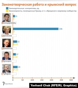 Из 13 законодательных инициатив, выдвинутых в том числе депутатами-крымчанами, было принято всего 5, в том числе 4 обращения к мировому сообществу.