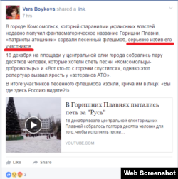 Телеканал Министерства обороны России со ссылкой на сайт «Политнавигатор» разместил сюжет с заголовком: «Боевики ВСУ избили людей за песню «Прощание славянки». К новости подкрепили видео: у местной елки человек в военной форме спорит с участником флешмоба. Он сказал, что пришел на событие «за Украину», на что человек в военной форме отвечает: «А слова песни ты читал?». На видео видно красные пятна на снегу. Канал «Звезда» пишет, что это ‒ кровь.