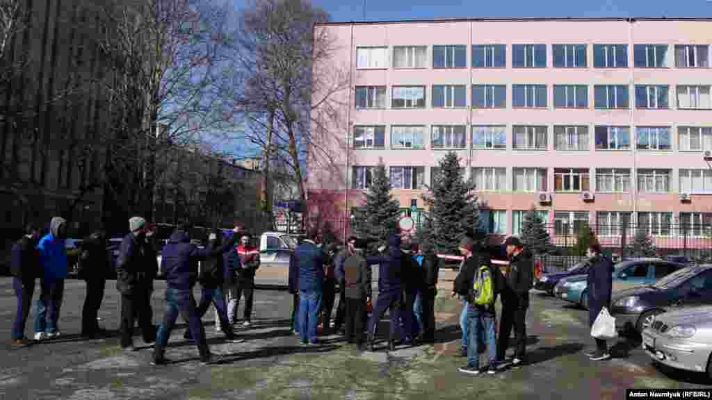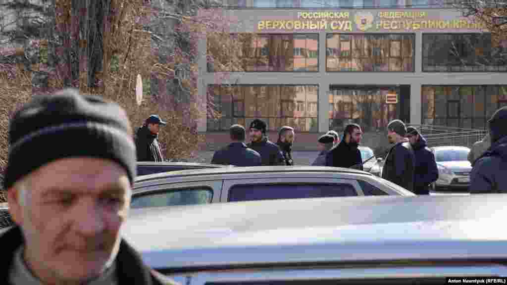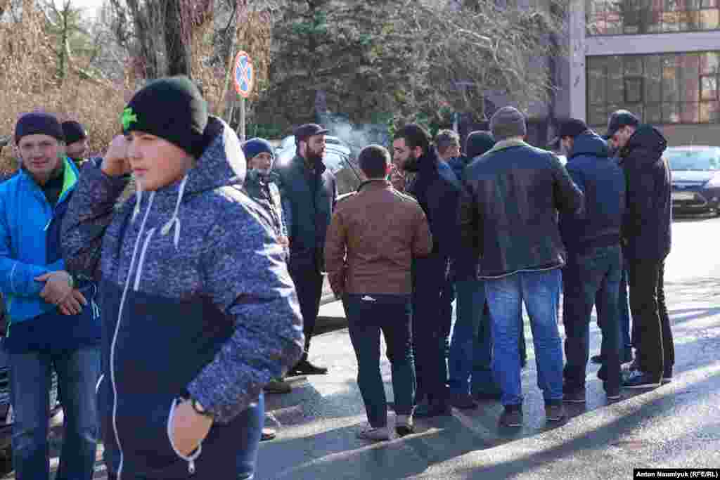К Железнодорожному отделу полиции Симферополя пришли десятки крымских татар встречать тех, кого арестовали после обыска у Марлена Мустафаева. Первых четверых освободили. Известно, что остальных шестеро задержанных планируют освободить вечером. 21 февраля состоялся обыск в квартире активиста Марлена Мустафаева. Российские силовики задержали его из-за сообщения в соцсети двухлетней давности с изображением символики запрещенной в России организации «Хизб ут-Тахрир». Одновременно полиция задержала 10 крымских татар, которые снимали на видео происходящее. Мустафаеву дали 11 суток ареста, а другим десяти – 5 (за «несанкционированный массовое мероприятие»).