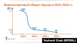 На протяжении 2014-2015 гг. внешнюю торговлю Крыма спасала Украина, которая, по версии российского Госстата, стала «внешнеторговым партнером». Так, в 2015 году экспорт крымских товаров на материковую Украину достиг $24,8 млн, что составляет 26% всего крымского экспорта и 90% вывозимых в СНГ товаров. Гражданская блокада полуострова и введение Кабмином Украины ограничений на поставки товаров в Крым и из него в конце 2015 года существенным образом снизили объемы торговли материка и оккупированного полуострова. По итогам 2016 года крымский экспорт в Украину сократился почти в 2 раза – до $13,9 млн.