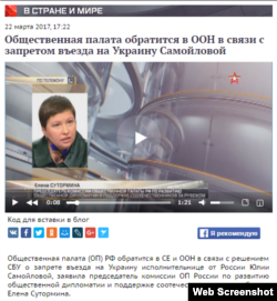 На сайте российского канала «Звезда» сегодня появилось сообщение, что решение Службы безопасности Украины нарушает закон. Об этом заявила председатель комиссии Общественной палаты России по развитию общественной дипломатии и поддержки соотечественников за рубежом Елена Сутормина. Она написала обращение в Совет Европы и ООН в связи с таким решением СБУ. Сутормина говорит, что такое решение показывает страх киевского руководства перед Россией, и то, что «они действуют не в правовом поле».