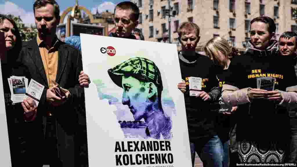 В столичной акции приняли участие около 50 человек: правозащитники, активисты, волонтеры. Они держали в руках портреты Сенцова, а также удерживаемых Россией крымчан Александра Кольченко и Алексея Чирния