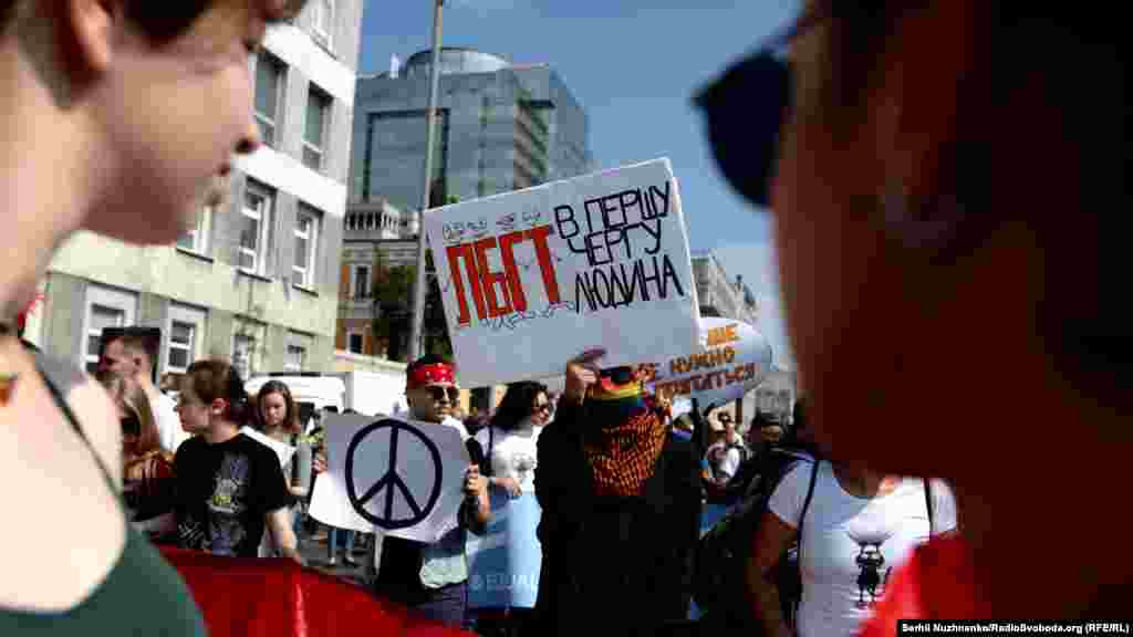 Перед началом марша противники акции, около сотни представителей преимущественно националистических организаций, недалеко от парка имени Тараса Шевченко, образовали «цепь», непрерывно двигаясь по пешеходному переходу.