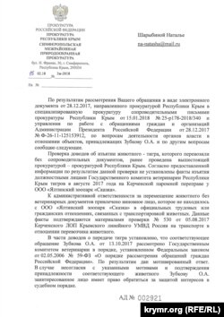 При этом, по информации российской Симферопольской межрайонной природоохранной прокуратуры, «проверка доводов об изъятии животного – тигра, которого перевозили без сопроводительных документов, ранее проведена вышестоящей прокуратурой – прокуратурой Крыма. Согласно предоставленной информации, по результатам данной проверки не установлены факты изъятия должностными лицами Государственного комитета ветеринарии Крыма тигров в августе 2017 года на Керченской паромной переправе у ООО «Ялтинский зоопарк «Сказка». К административной ответственности за перемещение животного без ветеринарных документов привечено виновное лицо, которое не находилось с ООО «Ялтинский зоопарк «Сказка» в официальных трудовых или гражданских отношениях, связанных с транспортировкой животных. Данные факты подтверждаются материалами проверки №530 от 05.08.2017 Керченского ЛОП Крымского линейного УМВД России на транспорте в отношении перевозчика животного» ». Об этом говорится в ответе прокуратуры от 15 февраля 2018 года, которым располагает редакция Крым.Реалии.