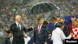 Вот тут пишут, что президент Путин оказался в позорной ситуации, не предложив Колинде Грабар-Китарович зонтик во время награждения, когда хлынул ливень. В результате наша хорватская гостья и Макрон успели вымокнуть до нитки и еще больше подружиться, судя по разным фоткам, - а Путин подружился с зонтиком.