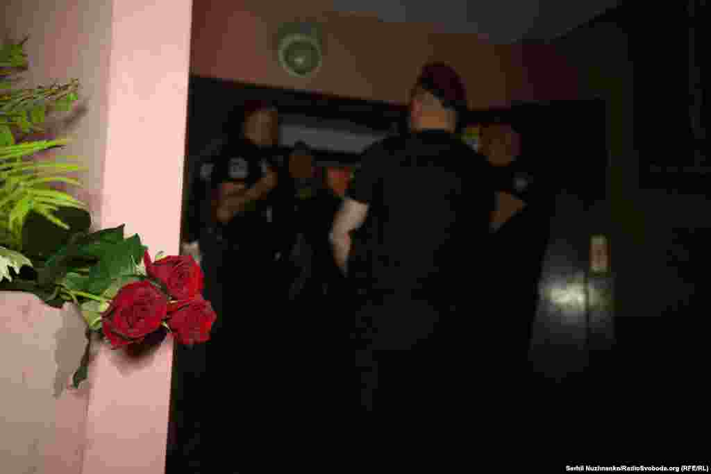 Полиция охраняет вход в подъезд дома, где был убит Аркадий Бабченко