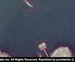 Эксперт по российскому флоту Эйч Ай Саттон по просьбе Радио Свобода идентифицировал их. Тот, что расположен ближе к острову, – это спасательное судно проекта 22870, такое же, как то, которое использовалось во время спасательной операции рядом с "Москвой" и с борта которого были сделаны облетевшие мир снимки горящего крейсера.