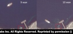 10 мая на спутниковых снимках Змеиного спасательное судно перемещается ближе к берегу, к корпусу затонувшей "Серны", который блокирует заход в бухту других десантных катеров.