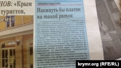«Крымские известия» разместили колонку Ирины Иванченко под заголовком «Накинуть бы платок на такой роток». Автора возмутили «киевские планы «вернуть и реинтегрировать» Крым к декабрю 2019 года, которые озвучил бывший народный депутат Алексей Журавко.
