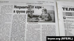 «Крымская правда» в статье «Непривитые от кори – в группе риска» рассказывает о возникновении очагов заболеваемости кори на полуострове и борьбе с ними. По данным газеты, подконтрольная Москве Федеральная служба по надзору в сфере защиты прав потребителей стабилизировала ситуацию. В сентябре 2018 года на полуострове привили против кори 5746 человек.