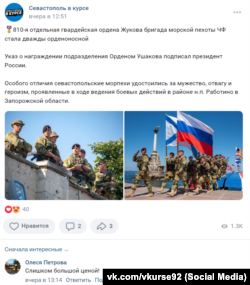 Скриншот публикации морпеха из 1-го дшб 810-й ОБрМП, село Работино Запорожской области