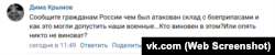 «Сообщите гражданам России, чем был атакован склад с боеприпасами и как это могли допустить наши военные… Кто виновен в этом? Или опять никто не виноват?» – спрашивает пользователь под ником Дима Крымов.