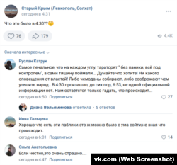 Первыми отреагировали в одном из ближайших к полигону населенных пунктов – пгт Старый Крым. «Что это было в 4:30?», – спрашивает в 04.31 автор темы в сообществе «Старый Крым (Левкополь, Солхат)» соцсети «Вконтакте».