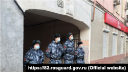Силовики Росгвардии охраняют дом по улице Киевской, 36, в Ялте после пожара 11 января 2021 года