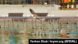 Главный фонтан, который в форме звезды ордена Победы, не работает уже почти два месяца. О причине российские власти города не сообщают, хотя на это неоднократно обращали внимание общественники и журналисты. Фонтан этот работал с перебоями с момента запуска, а сейчас загажен птицами, вода в нем цветет. А ведь с какой помпой его открывали в мае – телевидение со всей России понаехало. Сейчас только чаек и радует.