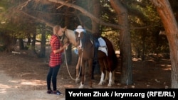 На лошадях прокатиться также никто не желает, их хозяйка что-то объясняет стоящей в тени сосен гнедой красавице в чепчике. Ее товарищ обмахивается хвостом и прядет ушами.
