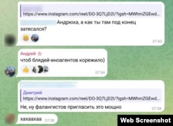 В институтской группе в телеграме одногруппники Соловьева обратили внимание на короткое видео телеканала "Дождь", в котором мелькают фотографии с форума антиглобалистов, в том числе и с их однокашником в кадре. "Андрюх, а как ты там под конец затесался?" – спрашивает один из них. "Чтоб бл*дей-иноагентов корежило", – отвечает Соловьев.