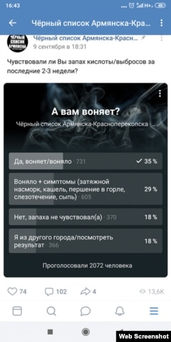 По результатам опроса, проведенного в группе «Черный список Армянск-Красноперекопск» в соцсети «Вконтакте» в начале сентября, из 2000 пользователей едкий запах чувствовали 1300 человек, при том большинство опрошенных не только чувствовали запах, но и отмечали определенные симптомы: затяжной кашель, першение в горле, высыпание.