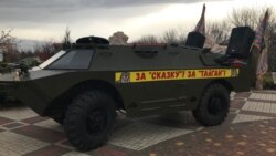 У входа в зал на территории парка львов «Тайган», где проходила пресс-конференция Зубкова, установили бронемашину с лозунгом «За «Сказку»! За «Тайган», а из динамиков звучала песня «Священная война», сообщает корреспондент Крым.Реалии.