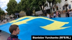 Эта акция проходила с 15 июня. Флаг крымскотатарского народа размером 16 на 9 метров пошили волонтеры в Краматорске в Донецкой области.