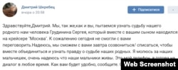 Также Шкребец опубликовал сообщение родных российского военного Сергея Грудинина, который находился на крейсере «Москва» и пропал без вести. Они хотят «узнать правду о судьбе родных».
