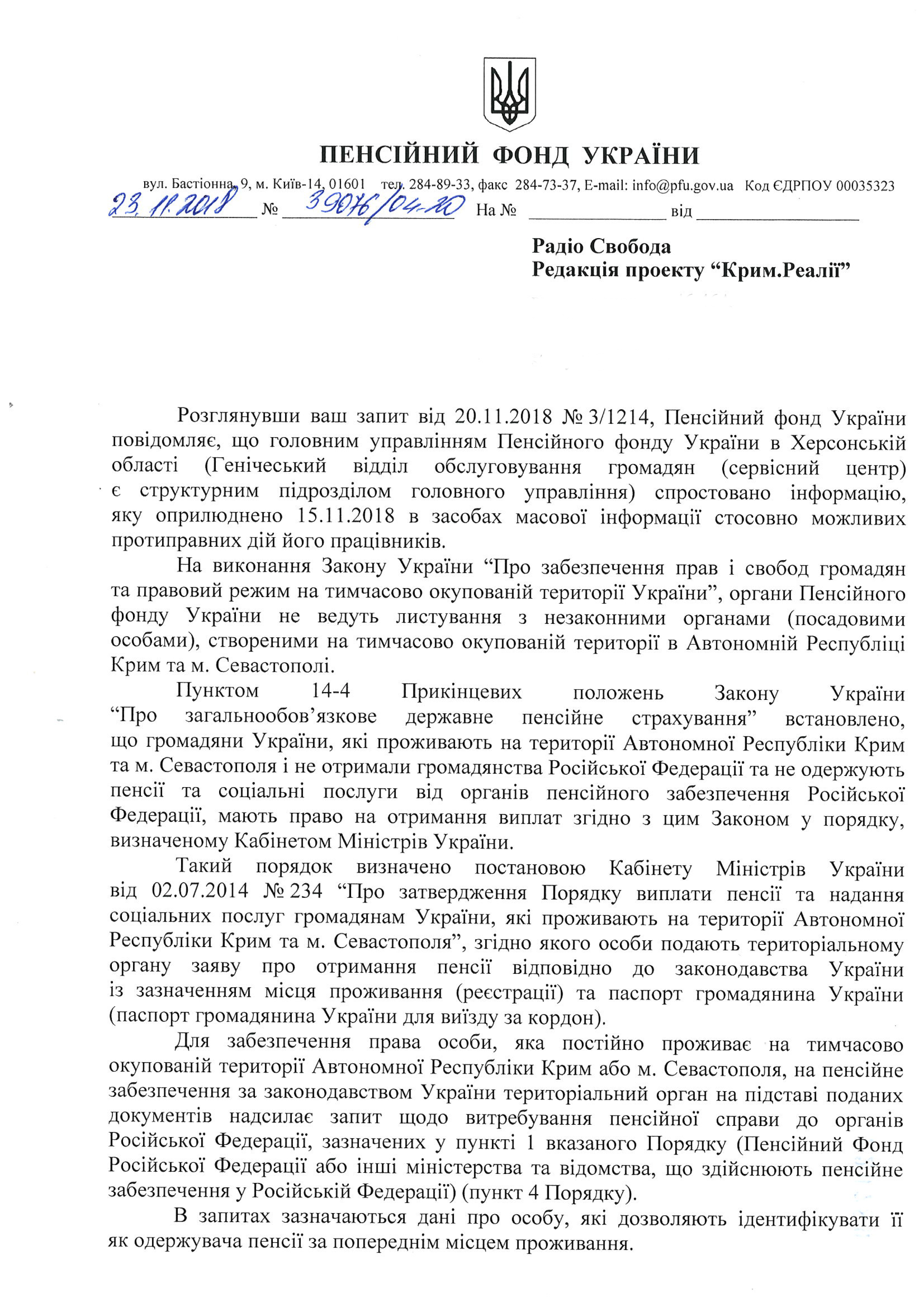 В Пенсионном фонде Украины отметили, что ведомство не ведет переписку с пенсионными органами аннексированного Крыма, а с Россией переписка ведется в соответствии с законодательством Украины и международным соглашением.