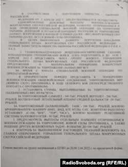 Соответствующий документ журналисты проекта Донбасс.Реалии Радіо Свобода получили в одном из разведывательных органов Украины. Согласно ему, за уничтожение самолета предлагается выплатить 300 тысяч рублей (111 тысяч гривен), вертолета – 200 тысяч (74 тысячи гривен), беспилотника средней дальности – 50 тысяч (18 с половиной тысяч гривен).