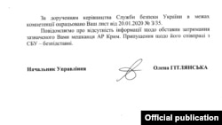«Сообщаем про отсутствие информации по поводу обстоятельств задержания указанного вами жителя АР Крым. Предположения по поводу его сотрудничества с СБУ – безосновательны», – говорится в ответе украинского ведомства.