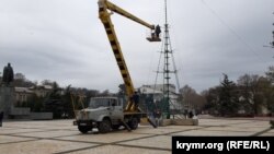 В Керчи на центральной площади Ленина рабочие монтируют искусственную новогоднюю елку на месте большого флагштока, на котором после российской аннексии Крыма был установлен флаг России.