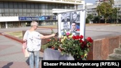 Жители Симферополя неохотно несут цветы к памятному стенду с портретом главы группировки «ДНР» Александра Захарченко, установленному на площади Ленина, сообщает корреспондент Крым.Реалии.