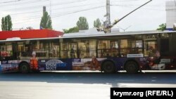 В аннексированном Крыму единственный новый пригородный троллейбус №21 «Перевальное-железнодорожный вокзал Симферополя» разрисовали изображениями строящегося Крымского моста, а также портретами его строителей.