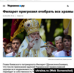 В интервью телеканалу на вопрос журналиста о собственности Московского патриархата в Украине патриарх Филарет заявил, что никакой собственности Московский патриархат в Украине нет.