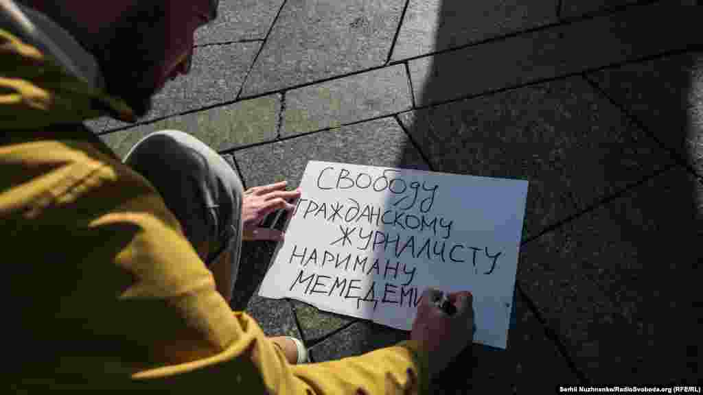Активисты пришли на акцию с изображениями Мемедеминова и плакатами «Журналистика не преступление», «Свободу Нариману», «Свободу гражданскому журналисту Нариману Мемедеминову».