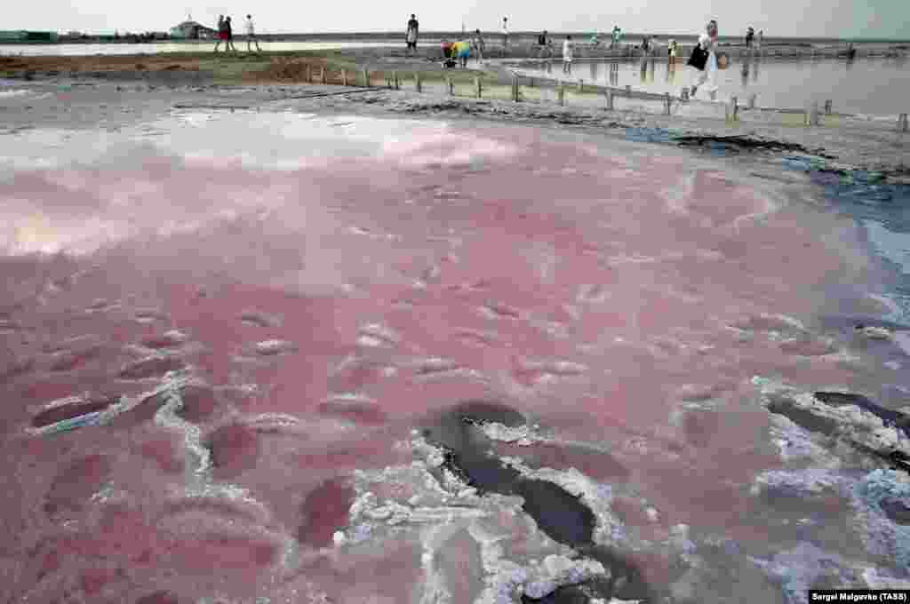 Между крымскими городами Евпаторией и Саками находится соленое озеро Сасык-Сиваш – самое большое в Крыму. Из-за цветения одноклеточных водорослей, водоем может приобретать цвет от нежно розового до интенсивного красного. Туристический сезон на озере стартует в конце июля и длится до конца сентября. Именно в это время озеро приобретает необычный розовый оттенок. Здесь добывают знаменитую даже за пределами Крыма розовую соль.