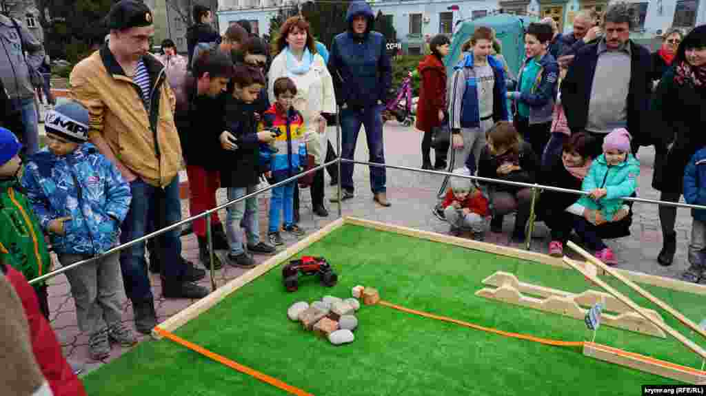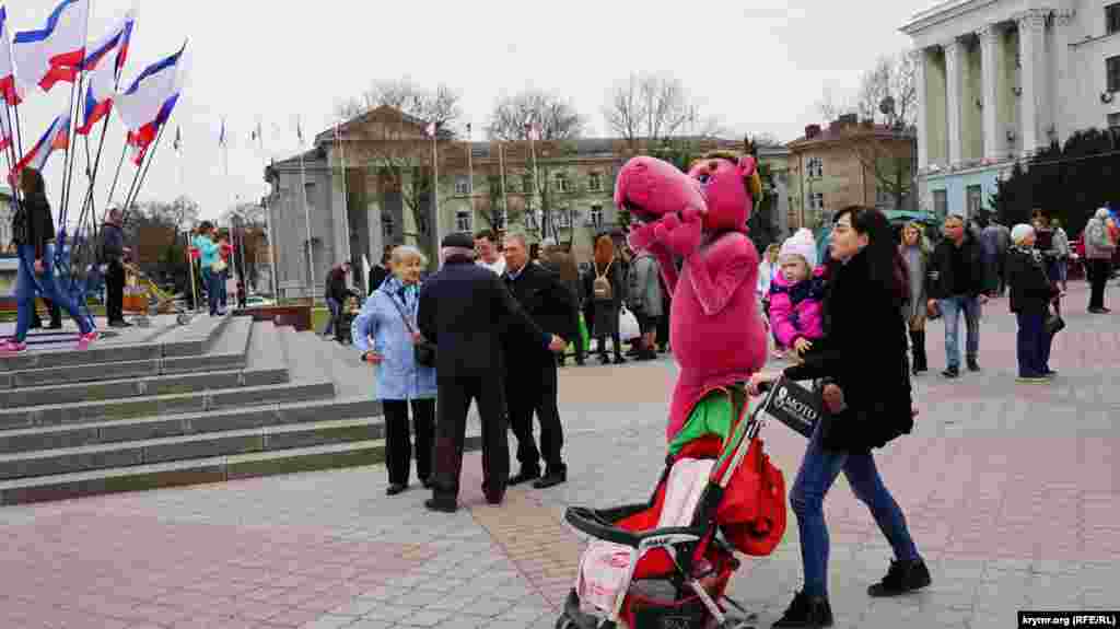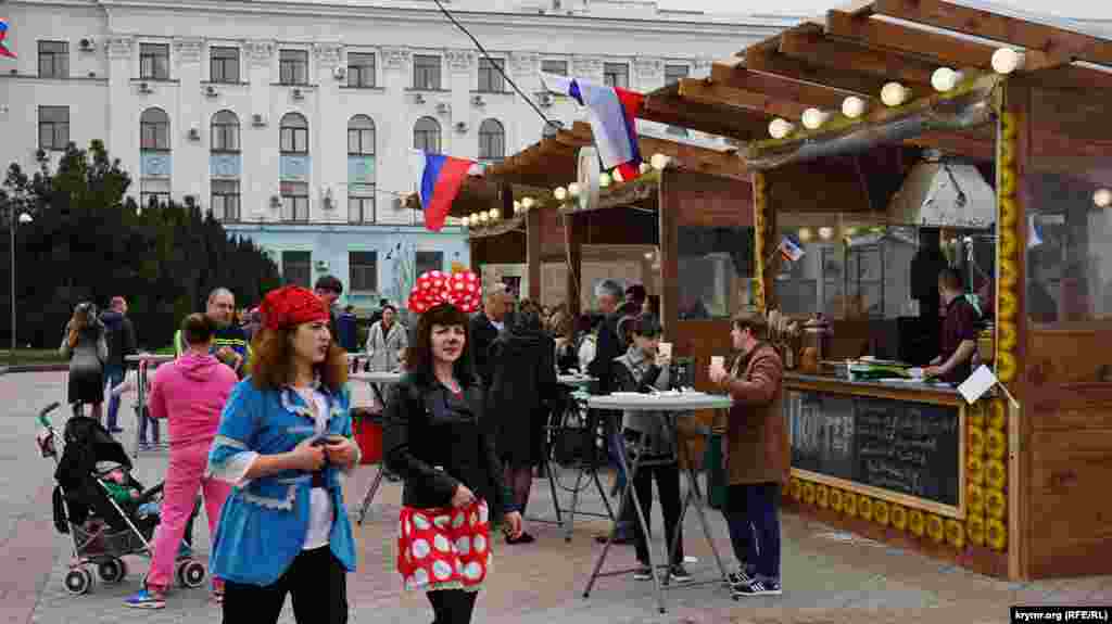 На площади Ленина в Симферополе в честь «годовщины референдума» устроили ярмарку: развернули торговые палатки с сувенирной продукцией и патриотической символикой. Детей развлекали аниматоры: показывали им авиамодели и мотоциклы.