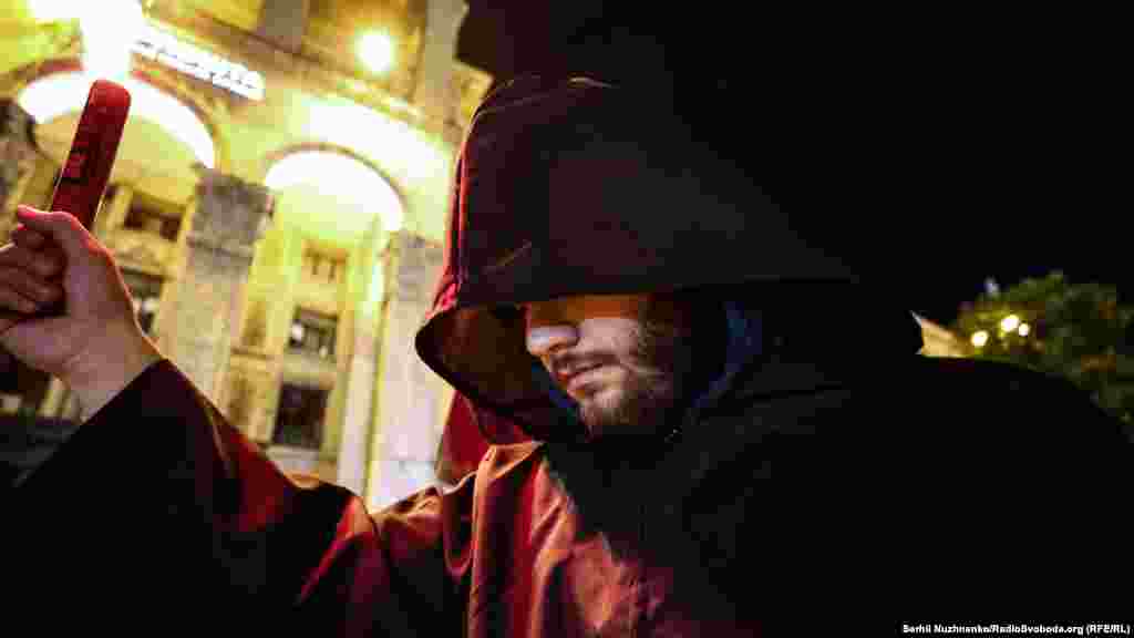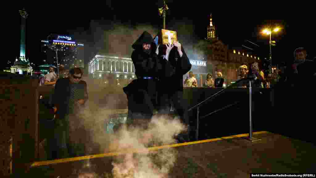 Активисты прошлись по центральной улице столицы с бандеролью-гробом. У Главпочтамта участники акции устроили перфоманс: «знахарь провел мистический обряд проклятия путинского режима».