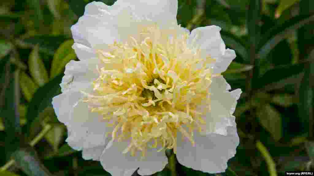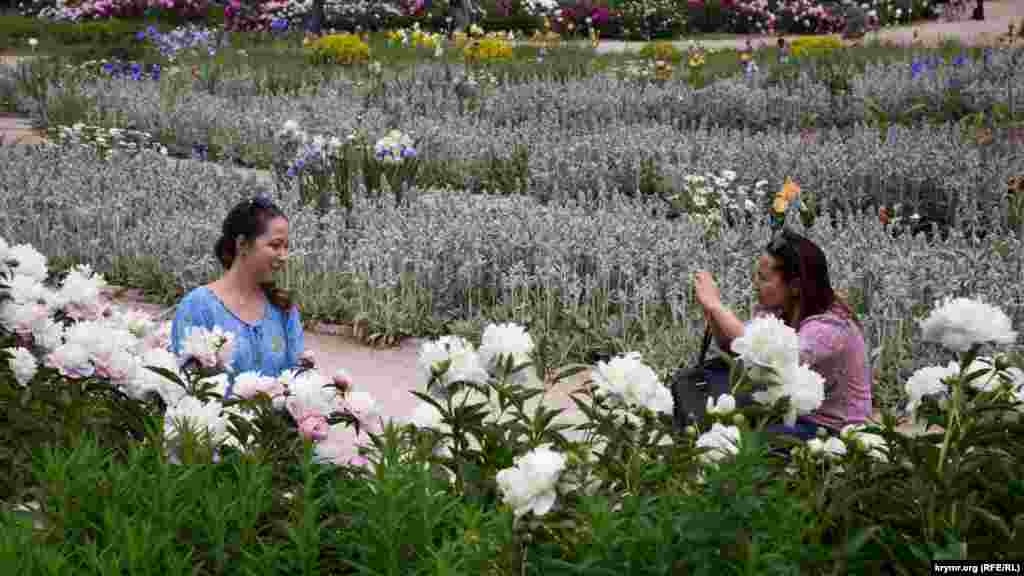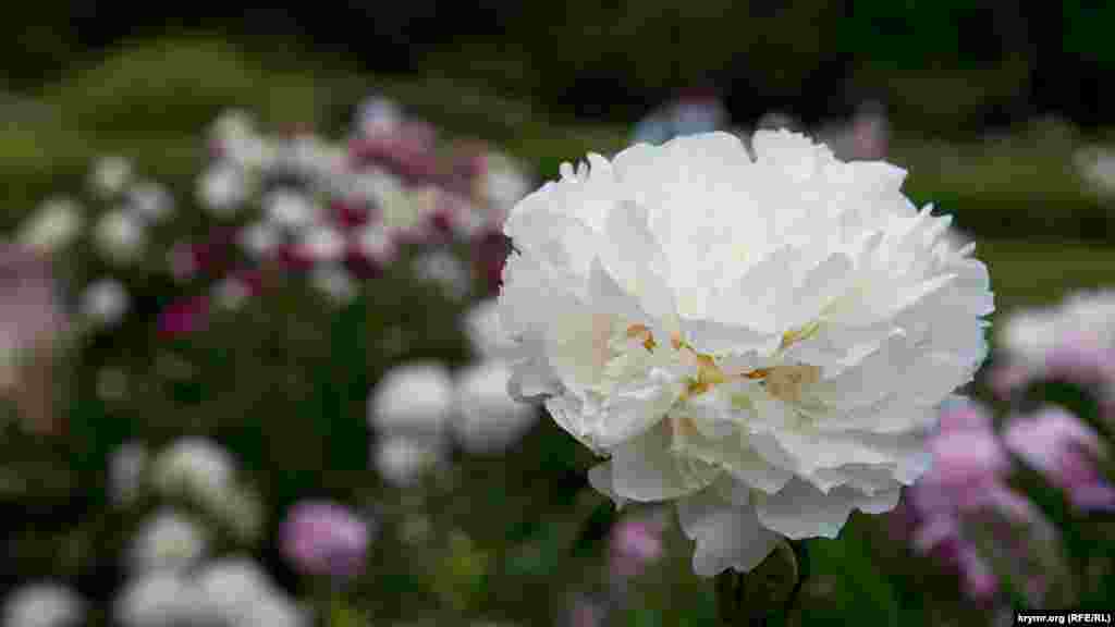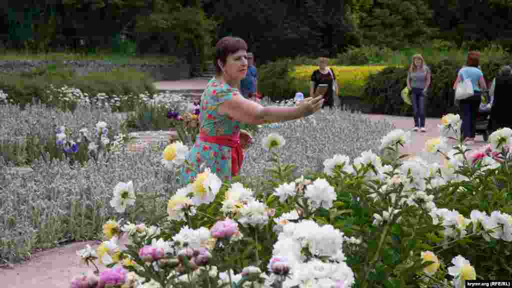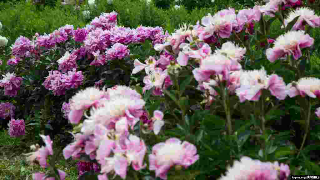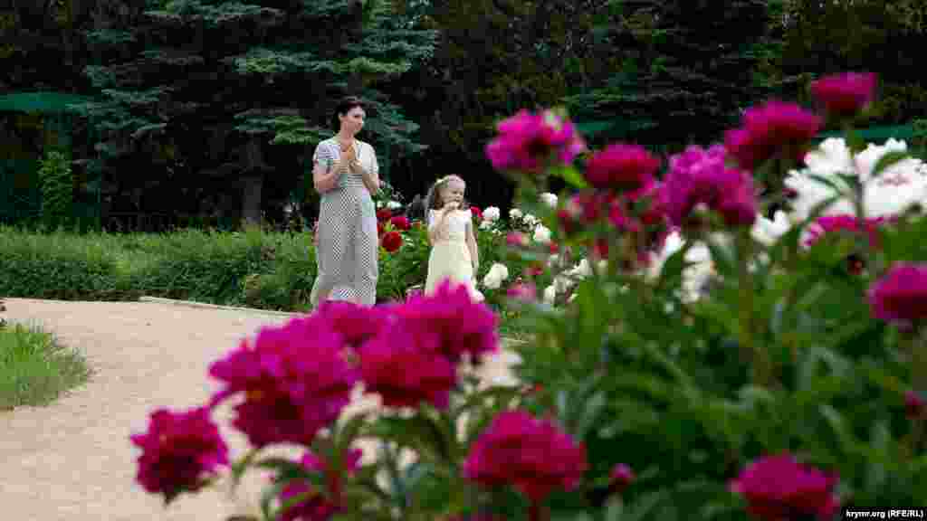 В Симферополе в ботаническом саду ТНУ им. Вернадского цветут белые, розовые и красные пионы. Горожане и гости города пришли полюбоваться цветами и сфотографироваться с ними.