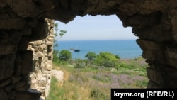 Вторая же башня Святого Климента, та, что ближе к морю, разрушена довольно сильно, но пока стоит. И являет собой отличный фотообъект. Вот вид из одного из окон этой башни: вдали море, а в нем полтора года уже грустно лежит сухогруз «Берг», который шел в Турцию, но затонул под Феодосией. Его притащили сюда и оставили.