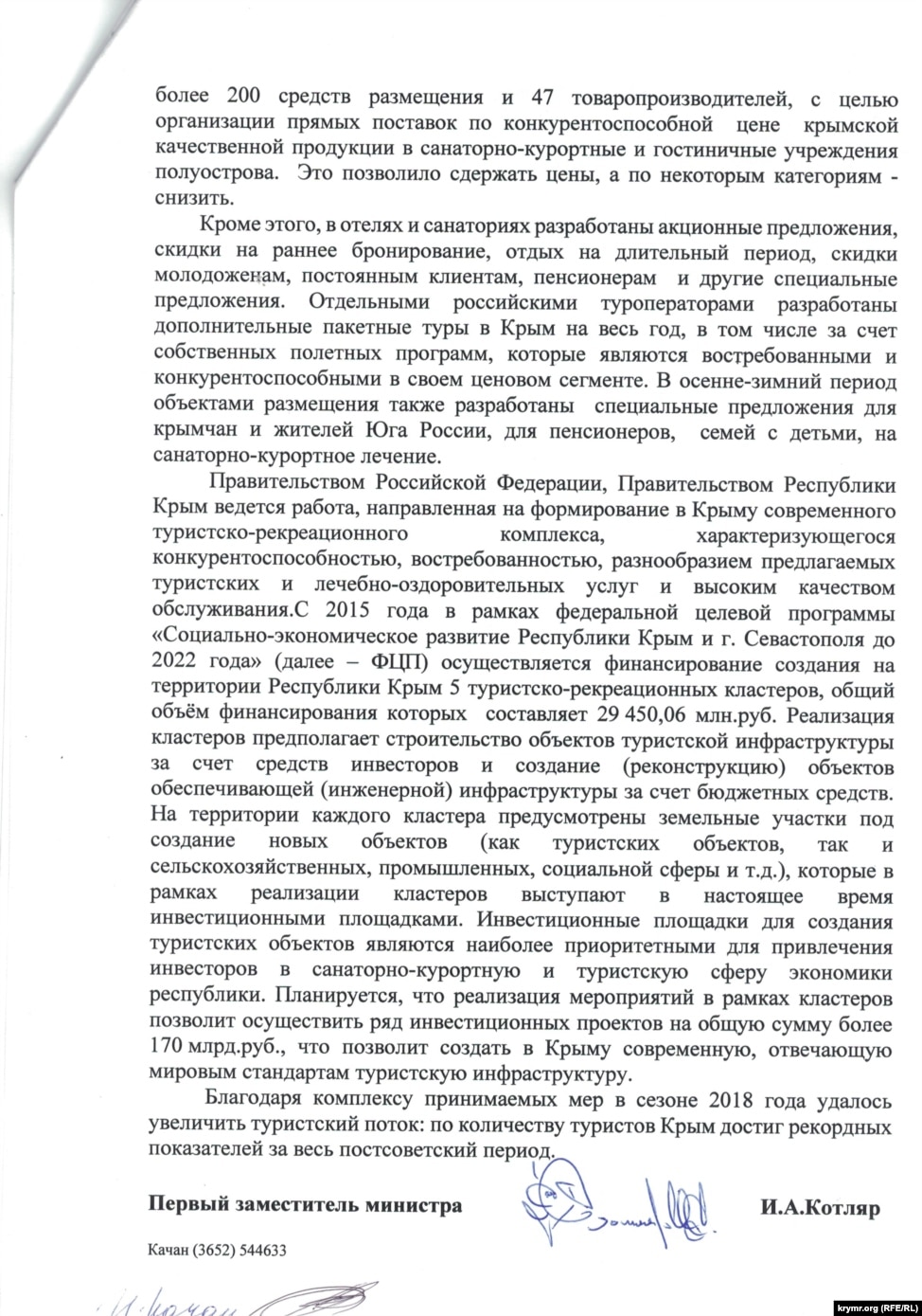«Развитие санаторно-курортного и туристского комплекса является приоритетным направлением развития экономики республики. В 2018 году на территории Республики Крым открыто 9 круглогодичных средств размещения, модернизацию и реконструкцию прошло более 80 санаторно-курортных и гостиничных организаций. Учитывая современные требования туристов к качеству оказываемых туристических услуг, в том числе к услугам размещения, высокую загрузку в активной фазе курортного сезона, часть санаторно-курортных и гостиничных учреждений закрываются на 1-2 месяца в зимний период с целью проведения ремонтных работ в номерном фонде и на объектах питания», – сообщается в письме российского Министерства курортов и туризма Крыма, которым обладают Крым.Реалии.