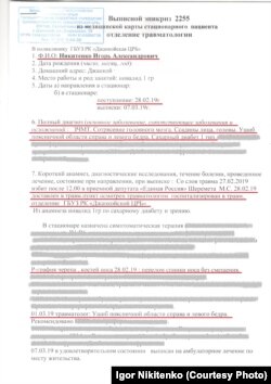 В документе указано, что с 7 марта Никитенко переведен на амбулаторное лечение. Оно продолжается до сих пор.