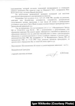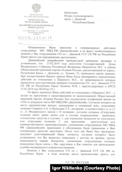 «Сотрудниками МВД правомерно и обоснованно были применены к вам специальные средства – наручники. После того, как вами был предъявлен документ, удостоверяющий вашу личность, согласно которому было установлено, что вы являетесь инвалидом с детства по зрению, сотрудниками полиции немедленно были сняты с вас (наручники – КР) и вас повезли на прохождение судебно-медицинского освидетельствования... Изъятая у вас в ходе осмотра места происшествия трость для передвижения, которой, согласно пояснениям пострадавшего и очевидцев инцидента, вы нанесли удар по Шеремету, возвращена вам 6 марта. По результатам проверки оснований для внесения документов прокурорского реагирования не имеется», – говорится в документе за подписью Олияра, которым располагают Крым.Реалии.