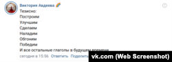 «Тезисно: построим, улучшим, сделаем, наладим, обгоним, победим. И все остальные глаголы в будущем времени», – резюмирует Виктория Авдеева.