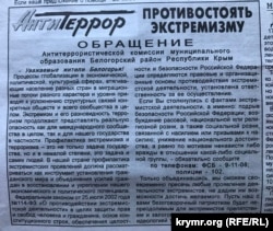 Силовикам и местным российским властям это очень не нравится, они ищут все новые пути, чтобы подавить мирное сопротивление в Крыму. В каждом районе созданы «Антитеррористические комиссии», которые работают в помощь силовикам. Так, в газете «Сельская новь» от 15 июня опубликовано очередное обращение данной комиссии, где жителей откровенно призывают к доносительству.