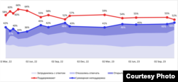 Группа людей, поддерживающих мир, в прошлом году была на уровне 35%, а в февральской волне этого года достигла 40% и с тех пор держится на том же уровне, не увеличиваясь. Но радикальные изменения произошли с группой людей, которые не поддержали бы решение вывести войска, готовы воевать. Их на данный момент 33%. Еще в сентябре, буквально за месяц эти цифры были – 40 и 41%, то есть эти две группы друг друга уравновешивали. Сейчас, когда люди увидели осенний призыв, увидели протесты и осознали, что военнослужащие без замены и отпусков сидят там так долго, произошло снижение поддержки войны до 52% и уменьшение числа людей, которые хотели бы продолжать воевать.